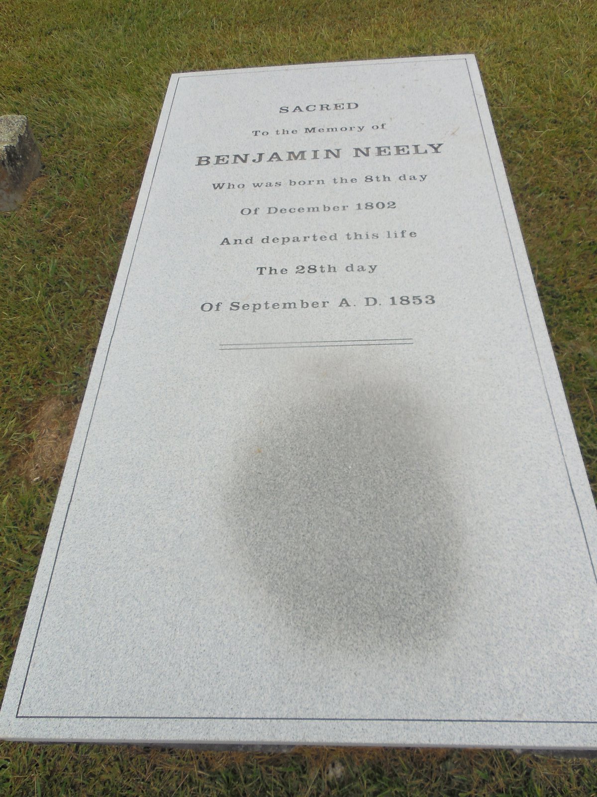 SACRED/To the Memory of/BENJAMIN NEELY./Who was born the 8th day/Of December 1802/And departed this life/The 28th day/Of September A.D. 1853.